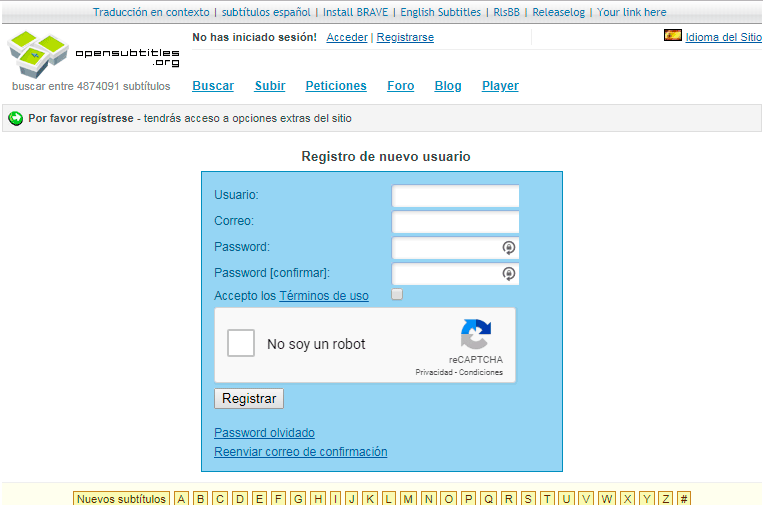 OpenSubtitles para Kodi requiere que tengas una cuenta, así que si aún no la tienes, debes crear una cuenta gratuita accediendo a su página web.Veremos cómo hacerlo en el siguiente apartado.