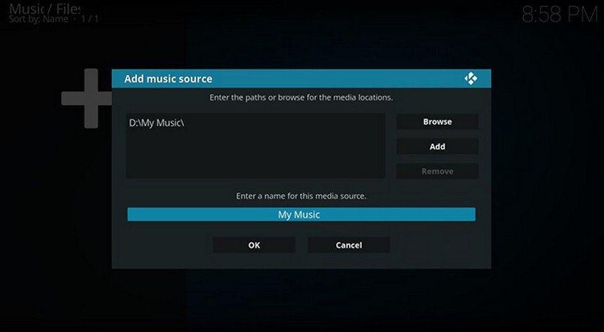 - Volverás a la pantalla anterior, en la que debes introducir un nombre para esta fuente de contenidos. Puedes introducir «Mi Música» a secas o cualquier otro nombre.