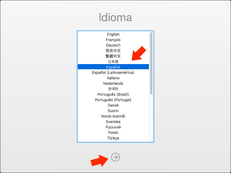 - Una vez iniciada la máquina, se cargará el instalador de macOS. Finalmente, deberías ver una pantalla de selección de idioma. Selecciona el idioma que prefieras y luego haz clic en la flecha continuar.
