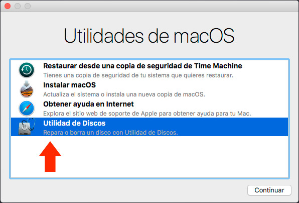 - A continuación se mostrará la utilidad de instalación de macOS. Primero debes formatear el disco virtual que has creado. Para ello haz clic en la Utilidad de discos.