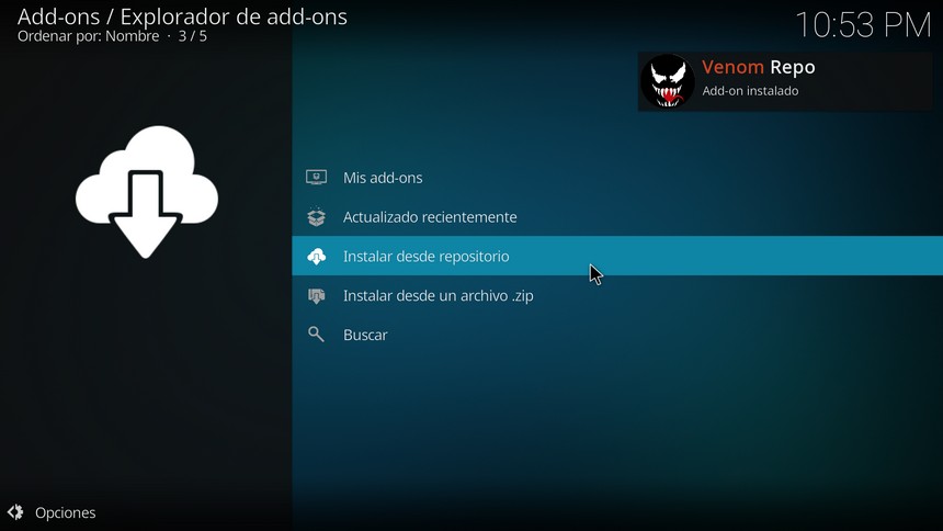 El repositorio de Venom se instalará nada más hacer clic en el archivo anterior. Verás un mensaje de confirmación al finalizar. - Accede de nuevo al explorador de addons y haz clic en instalar desde repositorio.